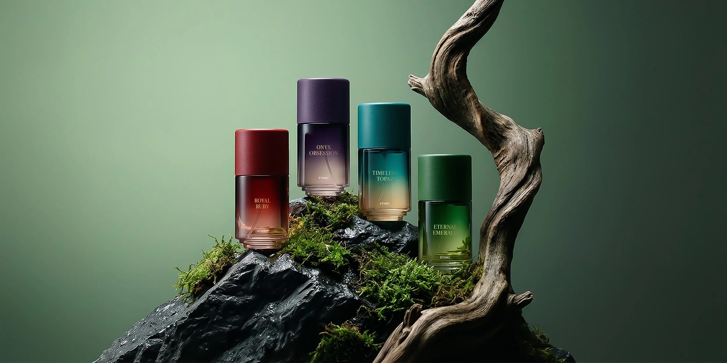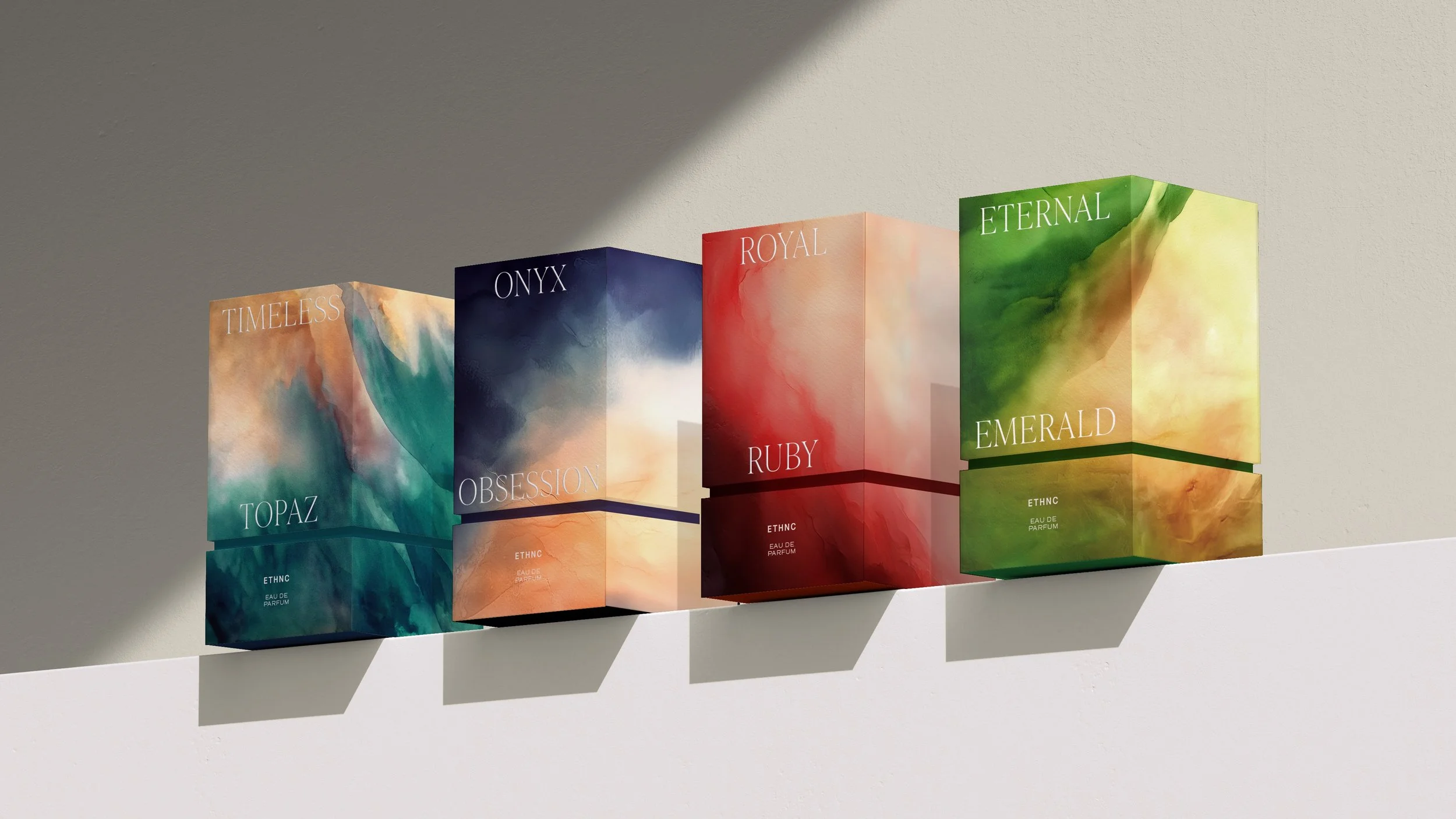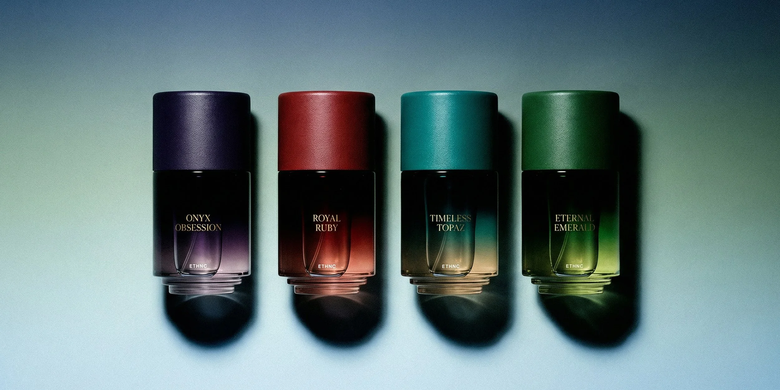 To evoke a sense of luxury, we drew inspiration from the symbolic power of precious stones. Each fragrance was paired with a gemstone that matched its personality, and from that starting point we developed names that combined sound harmony and character: Timeless Topaz, Royal Ruby, Eternal Emerald and Onyx Obsession.